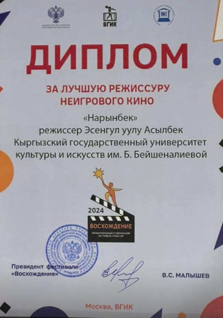 Б.Бейшеналиева атындагы КММИУнун кино жана телевидение факультетинин студенти Асылбек Эсенгул уулу Москвада өткөн эл аралык студенттер фестивалында “Мыкты даректүү тасманын режиссёру” номинациясына ээ болду. Ошондой эле 4 студентке катышкандыгы үчүн сертификаттар ыйгарылды.